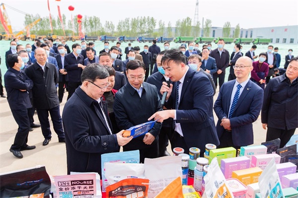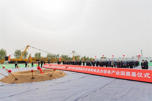 市委書記、市人大常委會主任楊洪濤宣布國泰民安寵物食品全鏈條產(chǎn)業(yè)園項目正式開工。主席臺領導共同為寵物食品全鏈條產(chǎn)業(yè)園奠基。